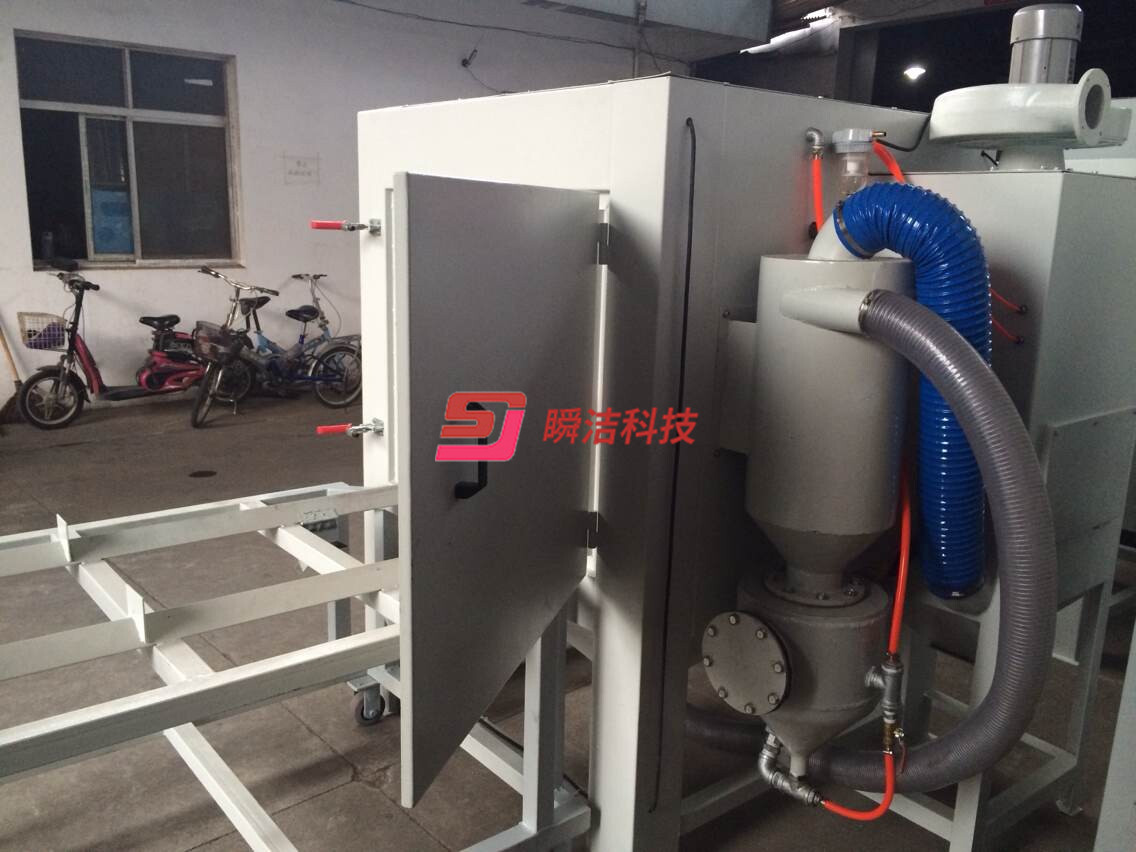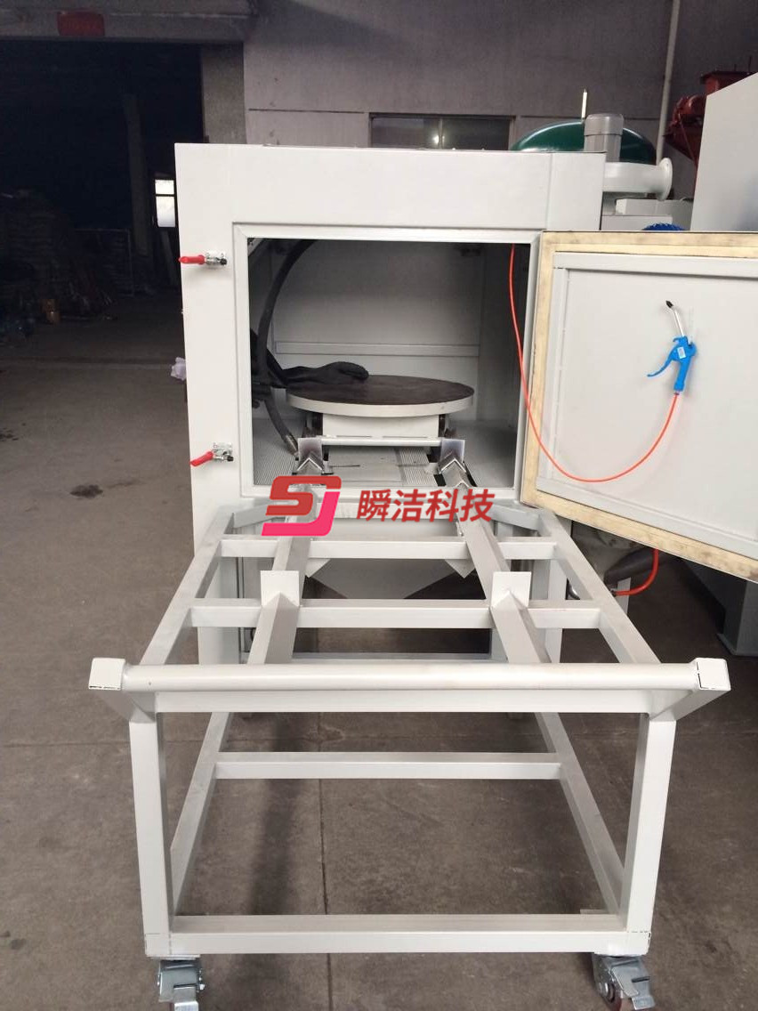 3、配備活動臺車,和轉盤,操作時將工件放在轉盤上,然后推入機內即可噴砂作業,操作簡單省力。